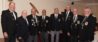 Ehrungen für langjährige Mitgliedschaften und Aktivitäten nahmen der 1. Vorsitzende Michael Kipp (links) und der 1. Kassierer Edgar Rensinghoff (2. v. rechts) beim Kommersabend vor (von links): Dieter Rogge (25 Jahre Mitglied), Reiner Upmann (25 Jahre Vorstandsarbeit), Oliver Upmann, Friedrich Prigge, Hans-Joachim Temme (jeweils 25 Jahre Mitglied), Detlef Dowidat (50 Jahre Mitglied). Foto: Bürgerschützen